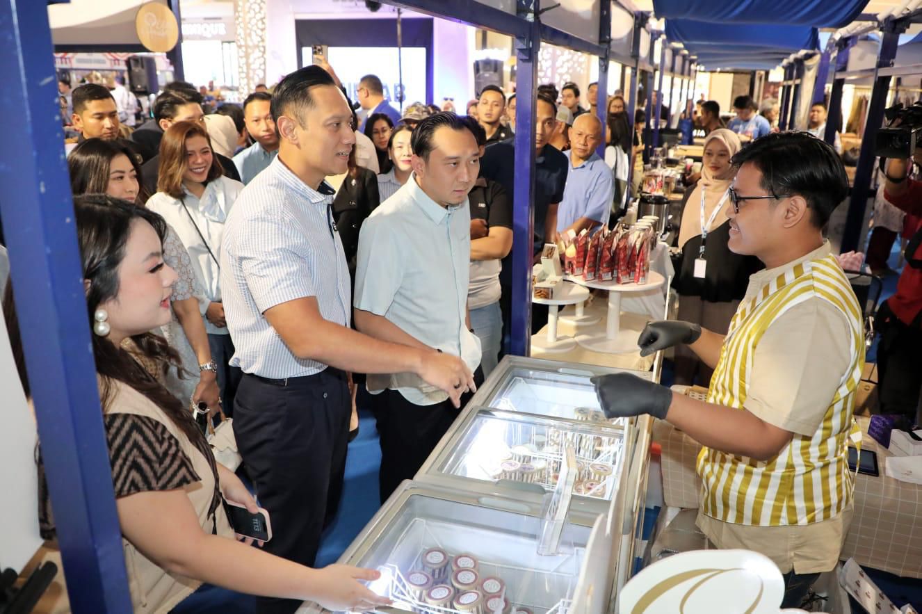 Begitu tiba di lokasi acara, AHY langsung meninjau booth-booth UMKM. Tidak hanya meninjau, AHY bahkan juga turut memborong barang jualan para pelaku UMKM, mulai dari makanan seperti pecel, hingga produk makanan ringan, pakaian serta kerajinan.